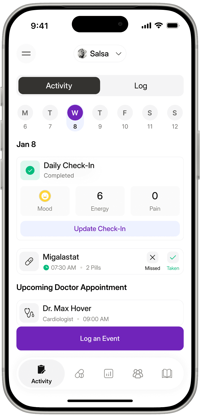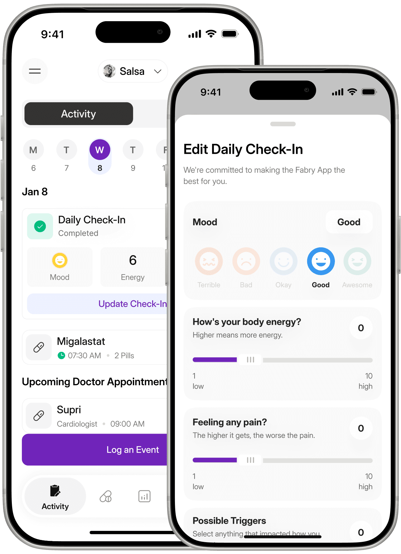 Managing Fabry disease is a team effort. That’s why The Fabry App helps you share updates, invite family members, and stay connected with your care team. Together, you can make every day a little easier.